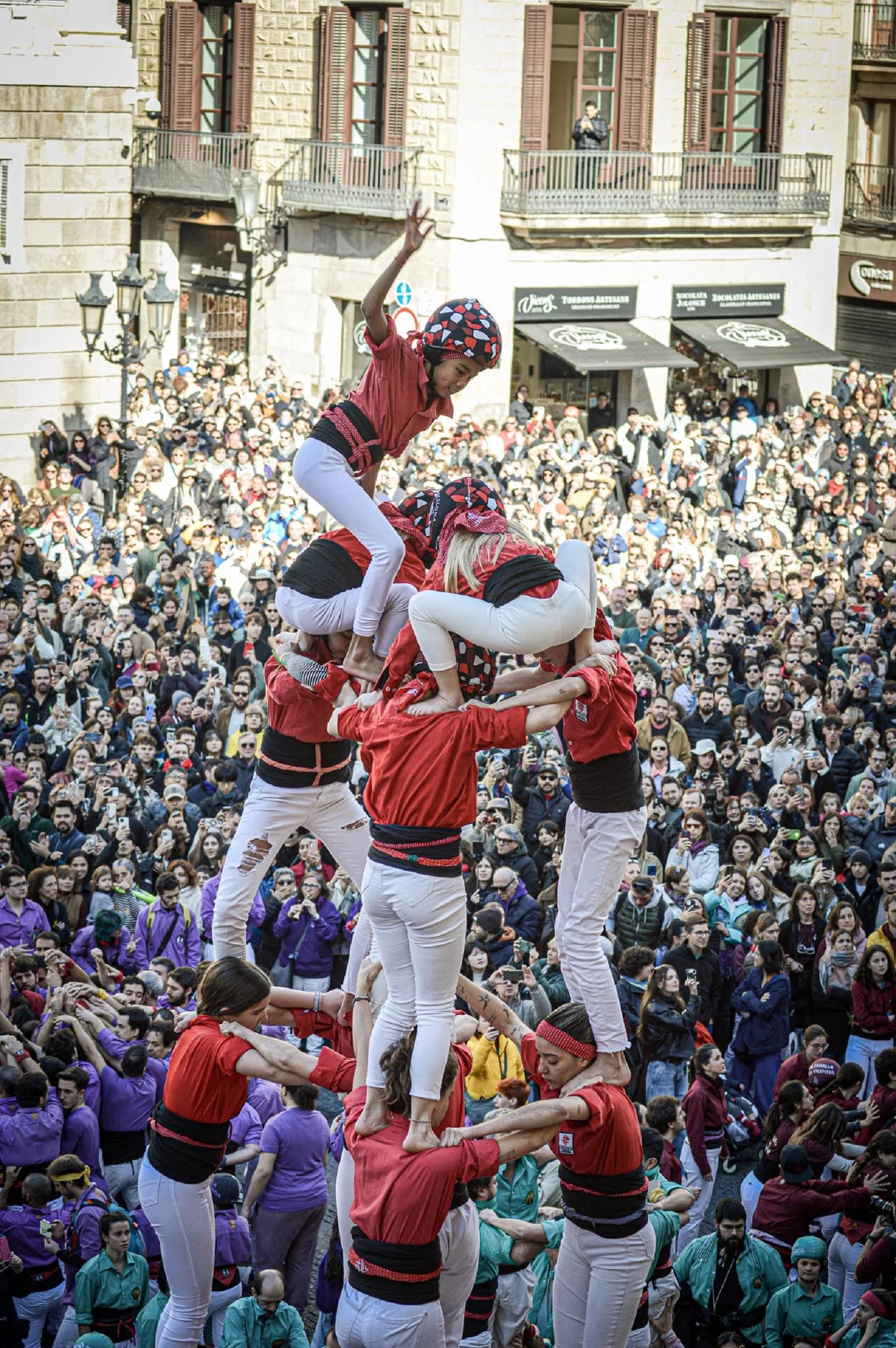 Després de concentrar-nos a la Plaça Nova, fèiem camí a la Plaça de Sant Jaume on hi entraríem a temps de començar en l’horari acordat les 11.30 h una diada amb el format de castells a l’antiga. El castell triat per a començar la diada i la temporada va ser el 5 de 7, castell amb un tronc reforçat al pis de terços i que va ser controlat i dominat en tot moment, i amb diverses estrenes tot i ser el primer castell de l’any.