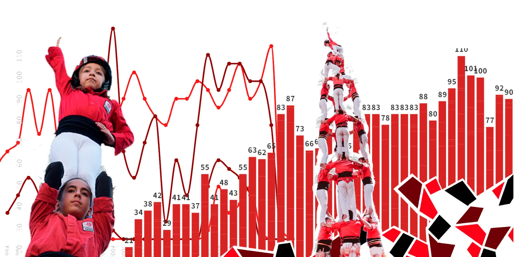 En la recuperació del 4 de 9 amb folre l’any 2013 la tendència és similar. Els tres anys previs a assolir-lo, els 4 de 8 descarregats a plaça augmenten, se’n descarreguen entre 15 i 17 cada any. I de fet, aquesta quantitat segueix creixent lleugerament els anys posteriors, quan també es va completar el 4 de 9 amb folre. Entre 2013 i 2018 els dos pics on el nombre 4 de 8 baixa coincideixen en els anys que es descarreguen més 4 de 9 amb folre (6 el 2014 i el 2017).