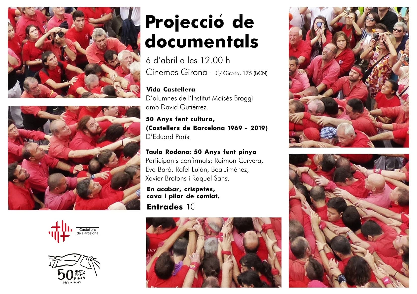 Els Castellers de Barcelona projectaran el proper 6 d’abril als Cinemes Girona, els dos documentals que s’han rodat per commemorar els 50 anys d’història que la colla compleix enguany. L’acte començarà a les 12.00 h amb la projecció dels dos documentals: